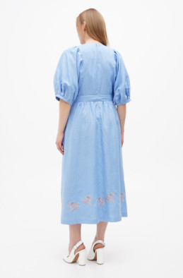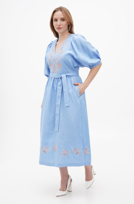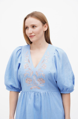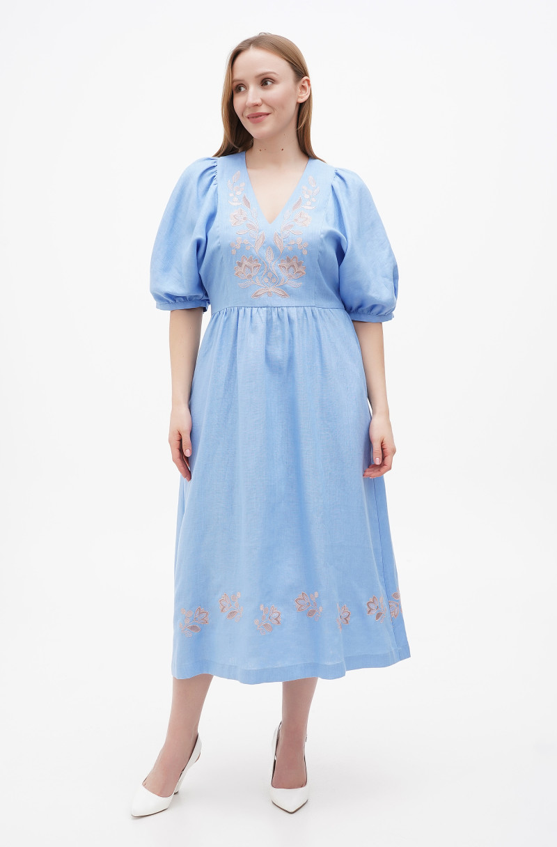 Сукня з льону з об'ємним рукавом на манжеті. По спинці застібка-блискавка, у бічних швах розташовані кишені. Перед і низ сукні прикрашені вишивкою.