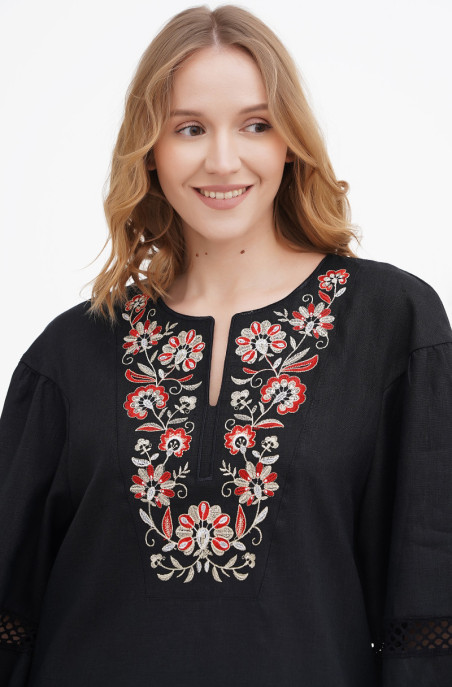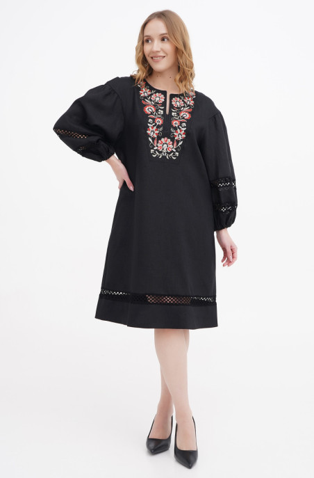 Урочиста лляна сукня для будь-яких типів фігур. Сукня А-подібного силуету, оздоблена вишивкою та мереживом. У бічних швах є кишені. Застібки немає.