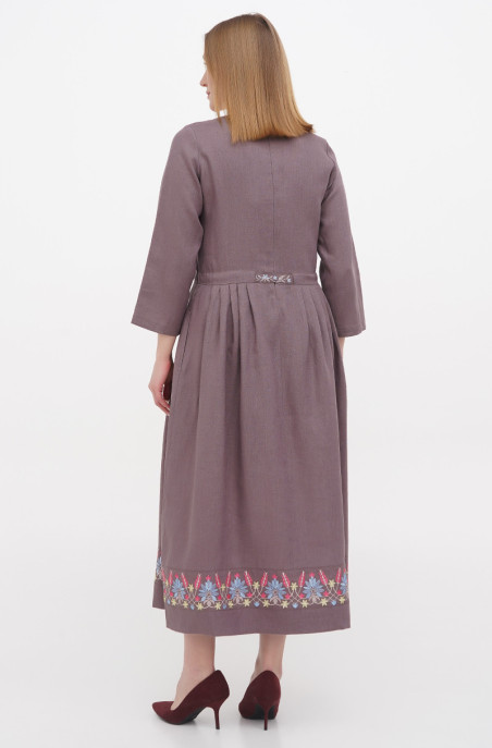 Урочиста вишивана сукня з льону, оздоблена вишивкою. Сукня відрізна по талії під пояс. По спинці застібка-блискавка, у бічних швах розрізи.