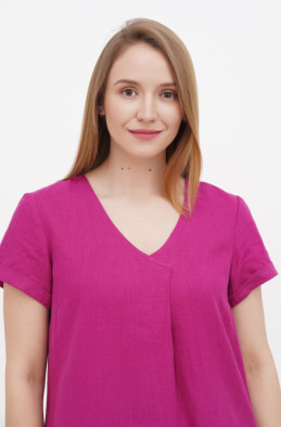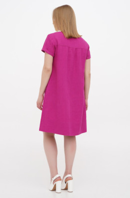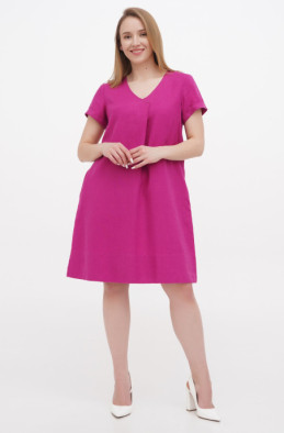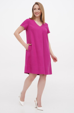 Лляна сукня з ефектом креш, силует А-подібний, застібки немає. У бічних швах є кишені. По горловині м'яка складка.