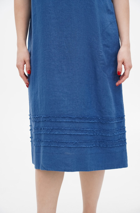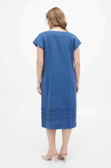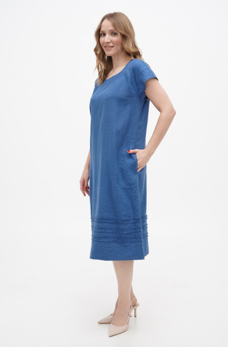 Лляна сукня для великих фігур. Сукня прямого силуету з ефектом креш, у бічних швах є кишені. Сукня без застібки.