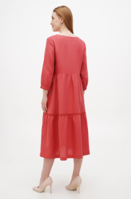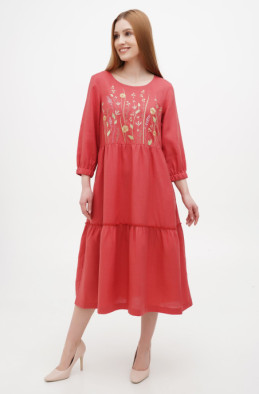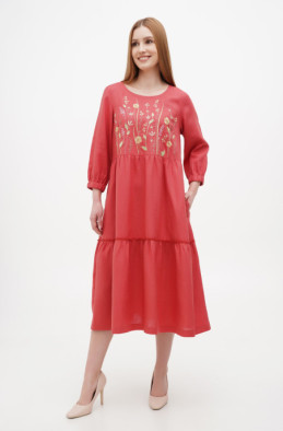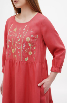 Вільна, розширена до низу сукня з тонкого льону, прикрашена вишивкою. У бічних швах є кишені. Сукня без застібки-блискавка.