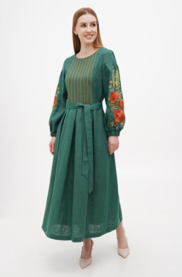 Святкова лляна сукня Х-подібного силуету, прикрашена вишивкою. У бічних швах розташовані кишені. Застібка-блискавка по спинці.
