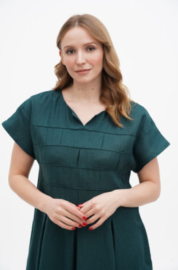 Вільна, пряма сукня з льону в стилі "Бохо". Рукав кімоно, в бічних швах розташовані кишені. По спинці застібка на ґудзики.