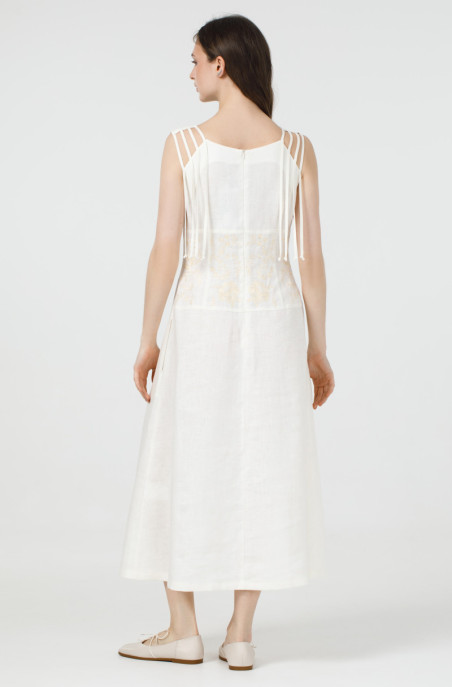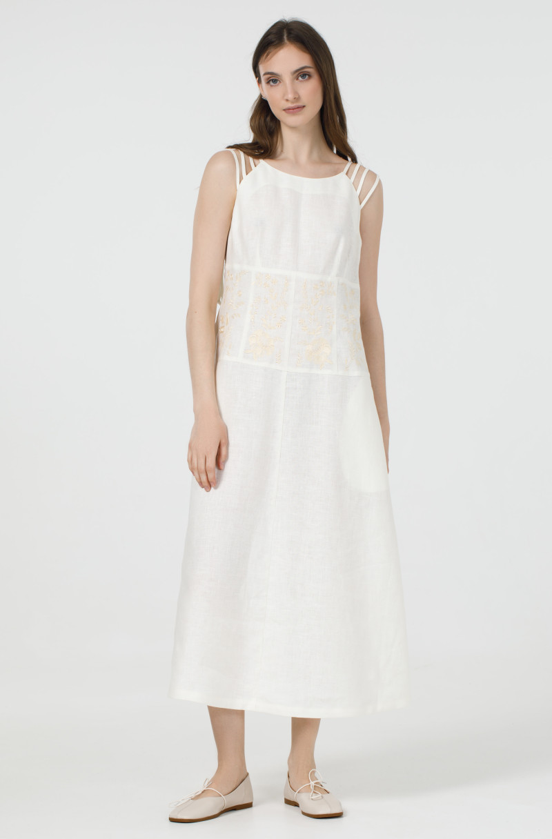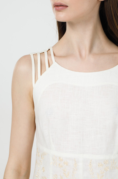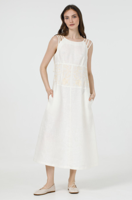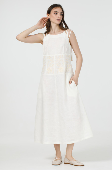 Вишукане лляне плаття без рукавів. По талії сукня звужена та прикрашена вишивкою. По спинці розташована застібка-блискавка, а бічних швах – кишені.