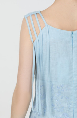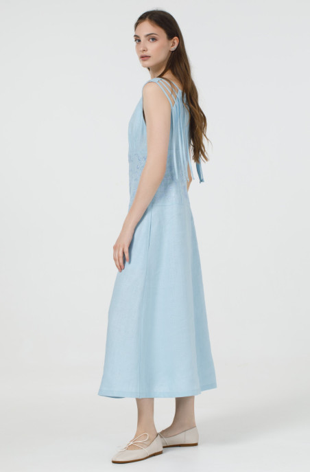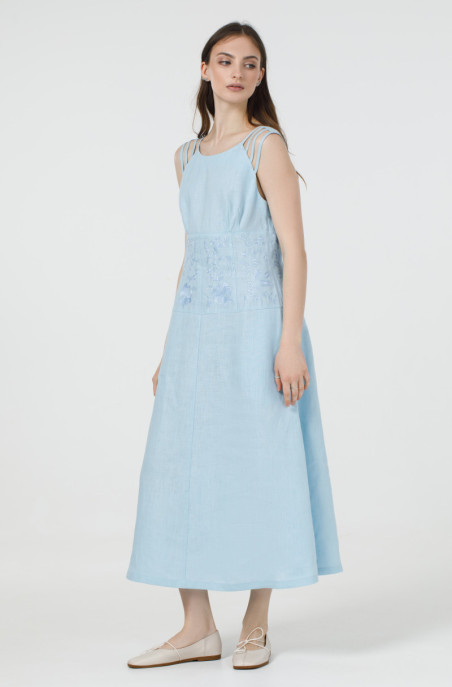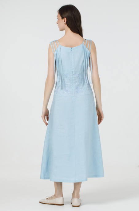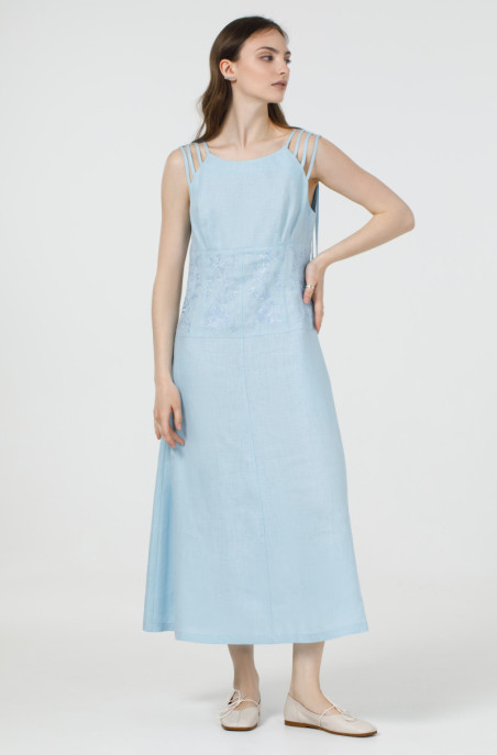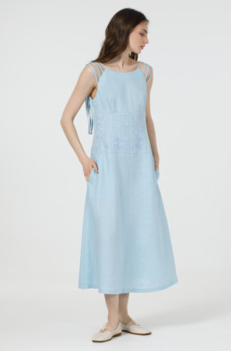 Вишукане лляне плаття без рукавів. По талії сукня звужена та прикрашена вишивкою. По спинці розташована застібка-блискавка, а бічних швах – кишені.