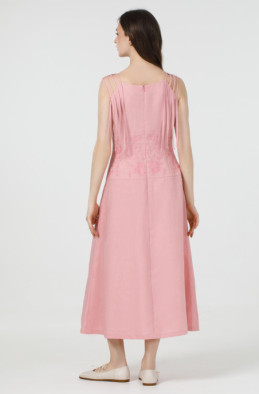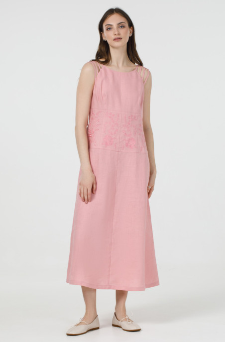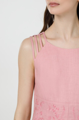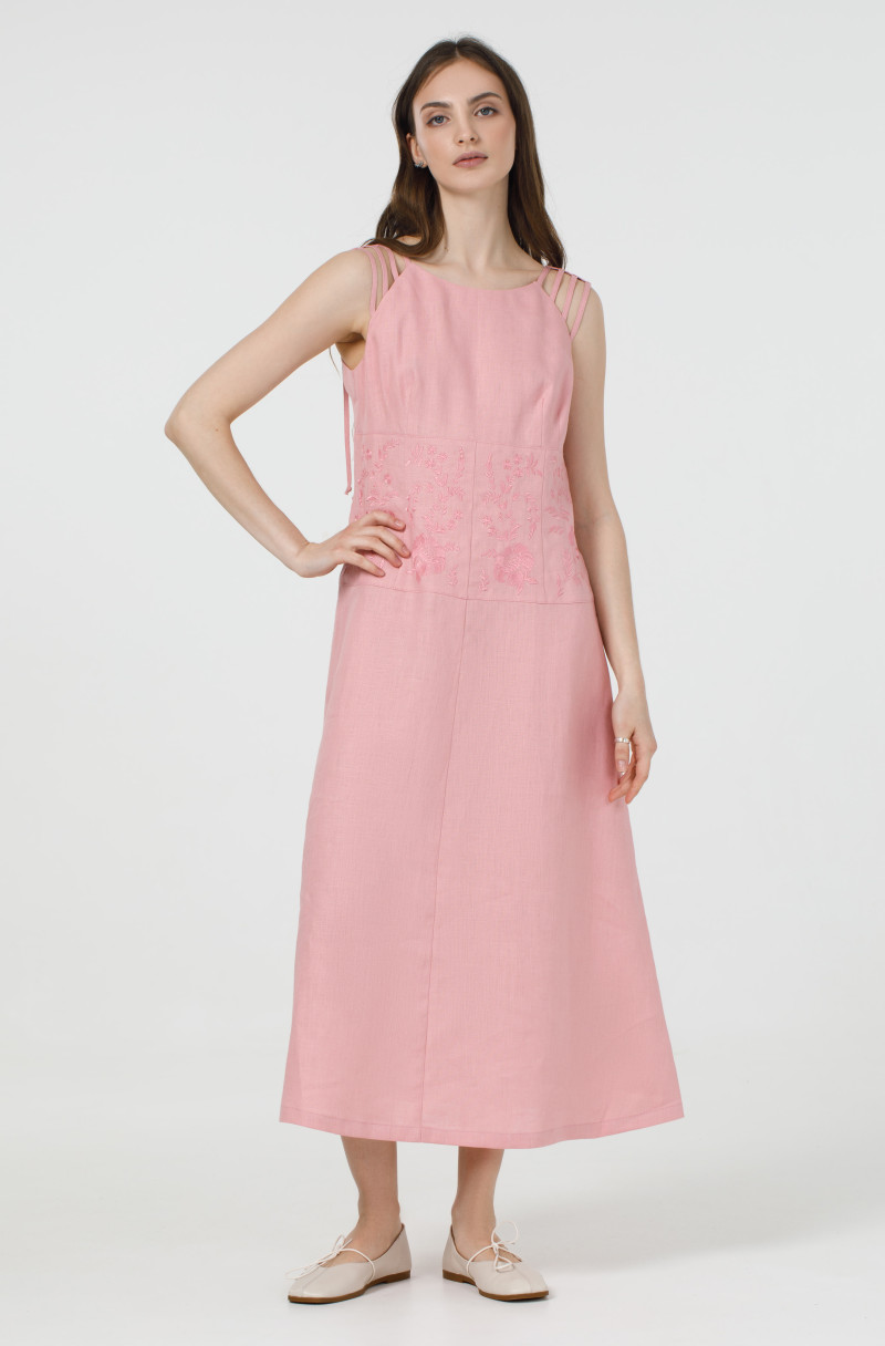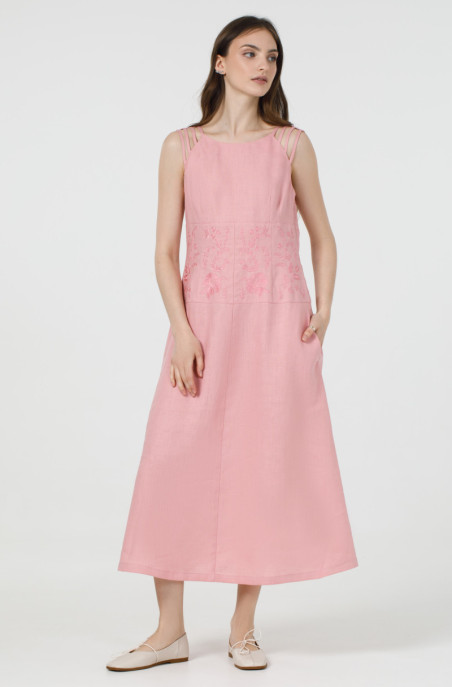 Вишукане лляне плаття без рукавів. По талії сукня звужена та прикрашена вишивкою. По спинці розташована застібка-блискавка, а бічних швах – кишені.