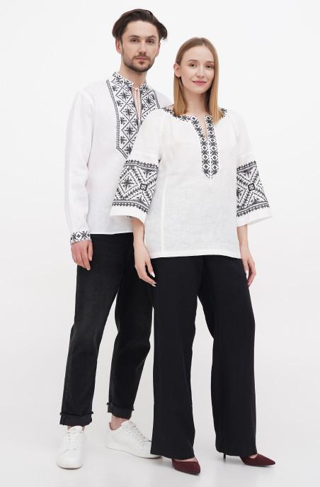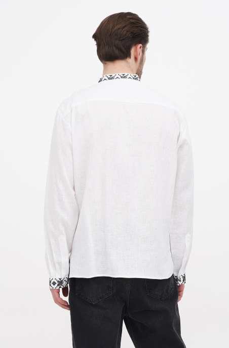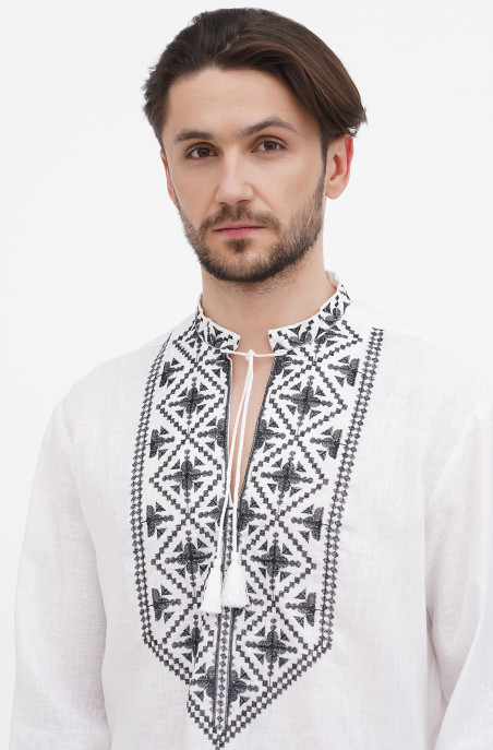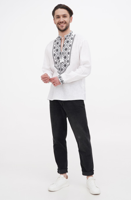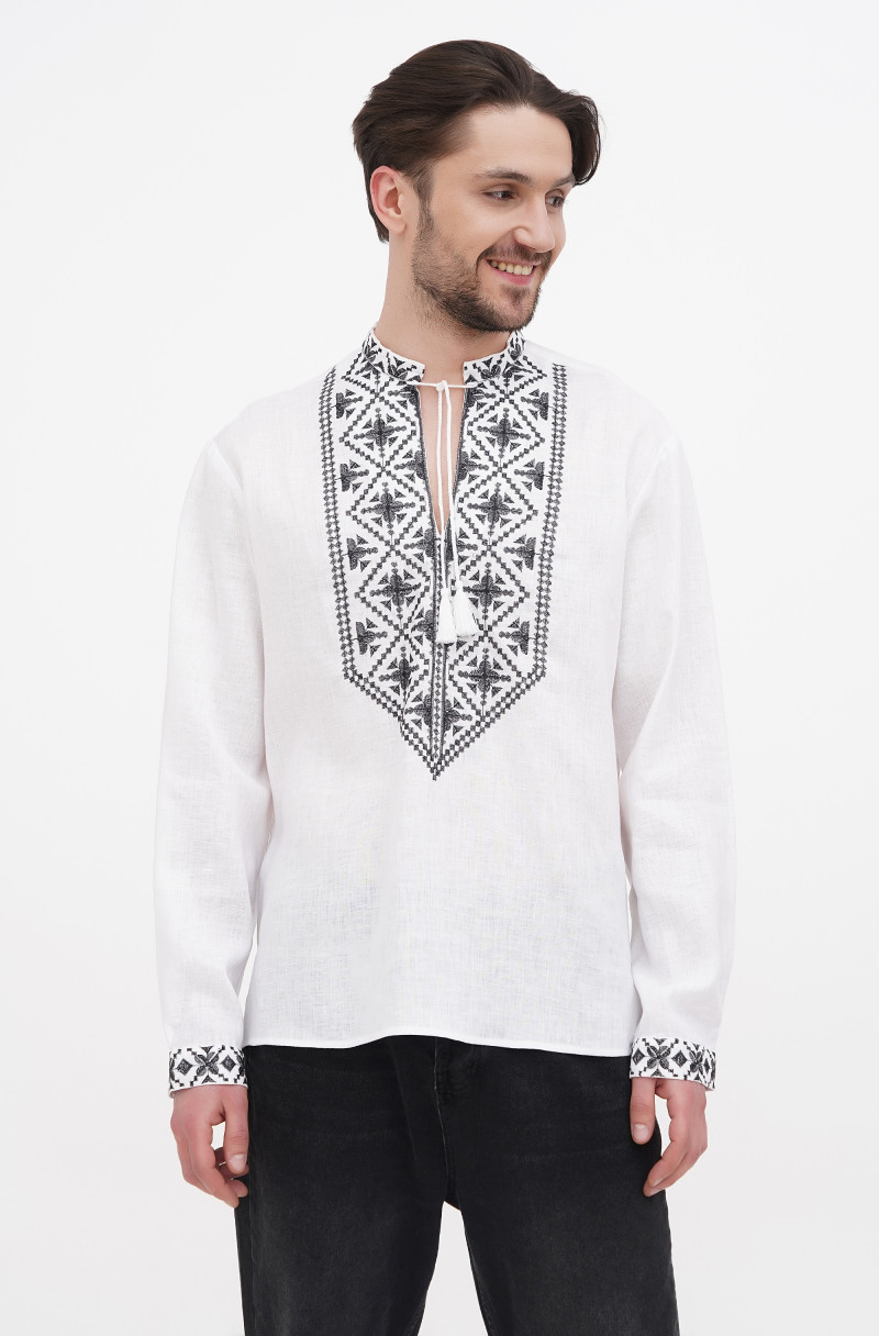 Вишита чорним кольором біла чоловіча сорочка. З вишитим комірцем-стійкою та манжетами. Сорочка без застібки.