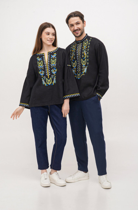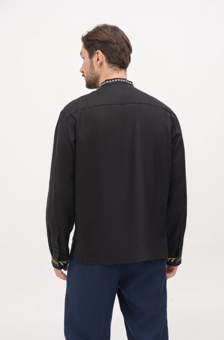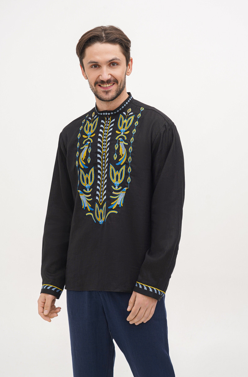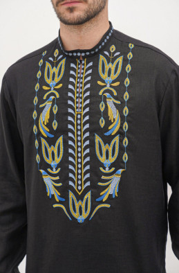 Вишита чоловіча сорочка з вишитим комірцем-стійкою та манжетами по низу рукавів. Має потаємну застібку на один ґудзик.