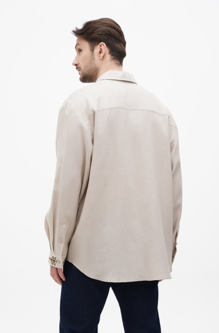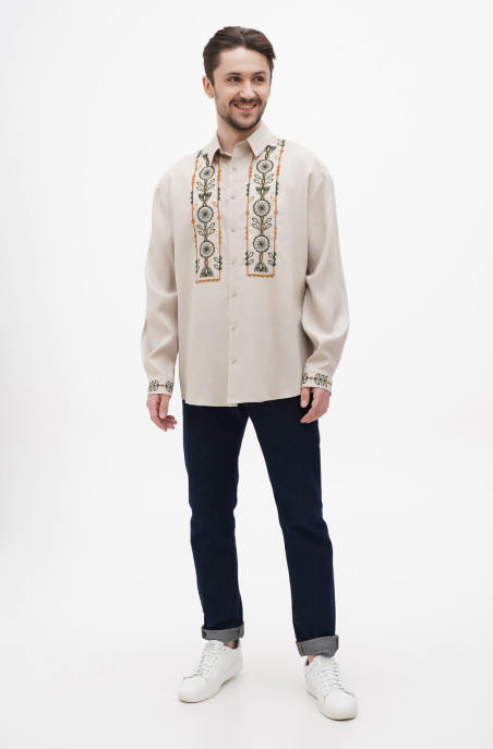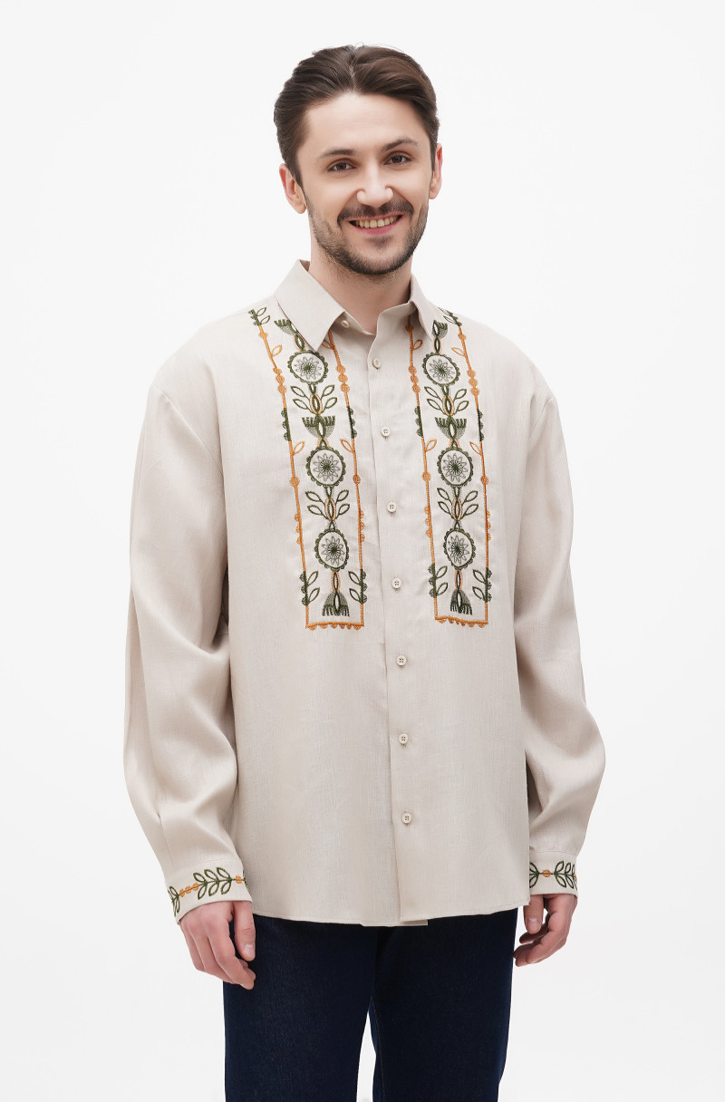 Вишита чоловіча сорочка. Класичний комір-стійка, низ рукава на манжеті. По переду застібка на гудзики.