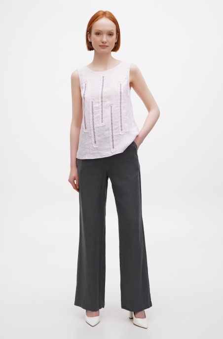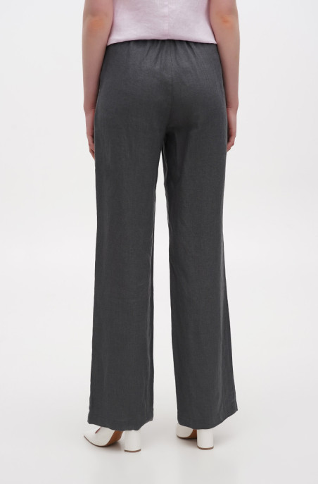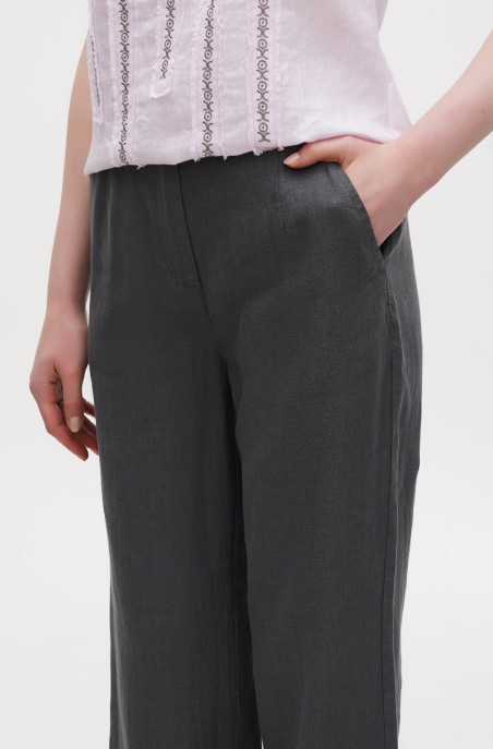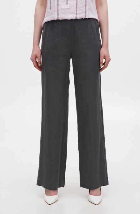 Вільні прямі штани із льону середньої щільності. У штанах є бічні кишені та застібка-блискавка по переду. Штани з ефетом креш.