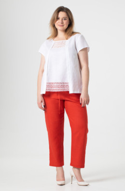 Укорочені штани з льону середньої щільності для великих фігур. Штани мають високу посадку по талії. Гарне прилягання по талії забезпечує гумка та шнурок. Штани звужені до низу, зі сторони бокового шва по низу є розрізи. Штани без застібки-блискавки. (Код 80001/48/1361)